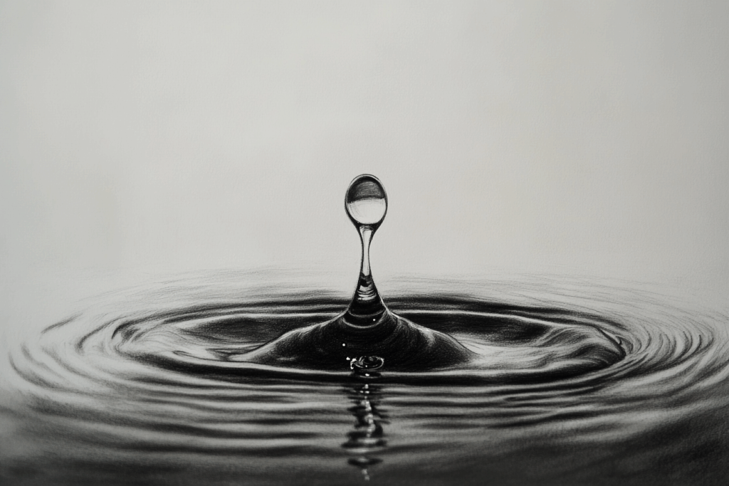 Hieronder zie je een afbeelding van een waterdruppel. In eerste instantie lijkt het een foto maar als je goed kijkt zie je dat het met houtskool is “gemaakt”.